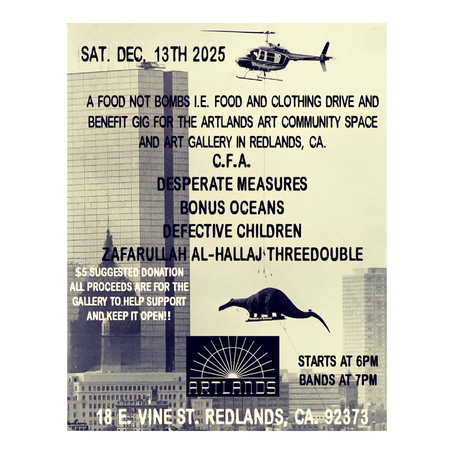 FOOD NOT BOMBS IE X ARTLANDS PRESENT | C.F.A., DESPERATE MEASURES, DEFECTIVE CHILDREN, BONUS OCEANS, & ZAFARULLAH AL-HALLAJ THREEDOUBLE